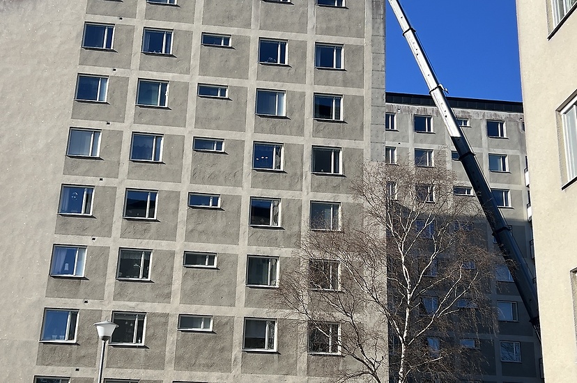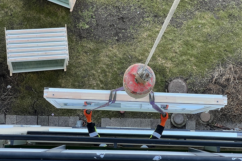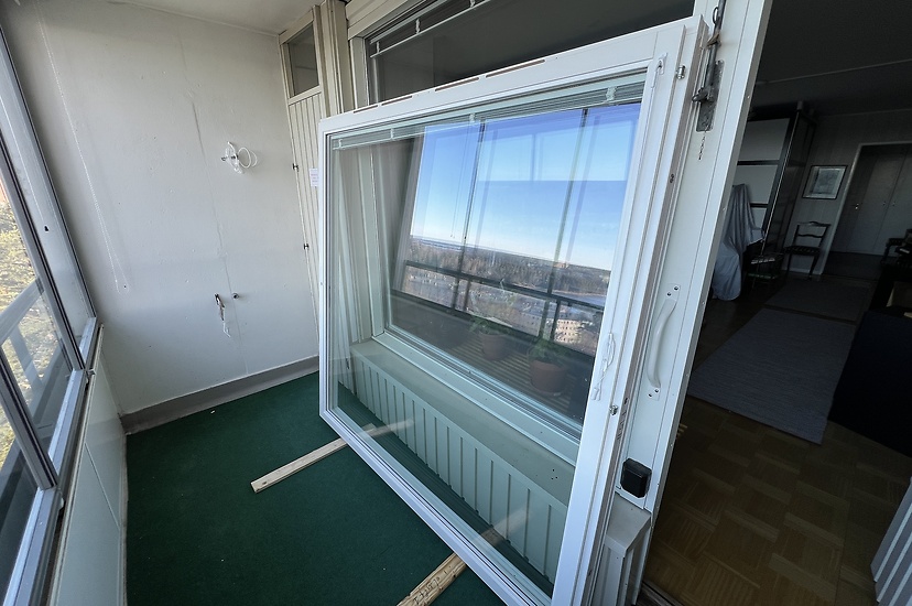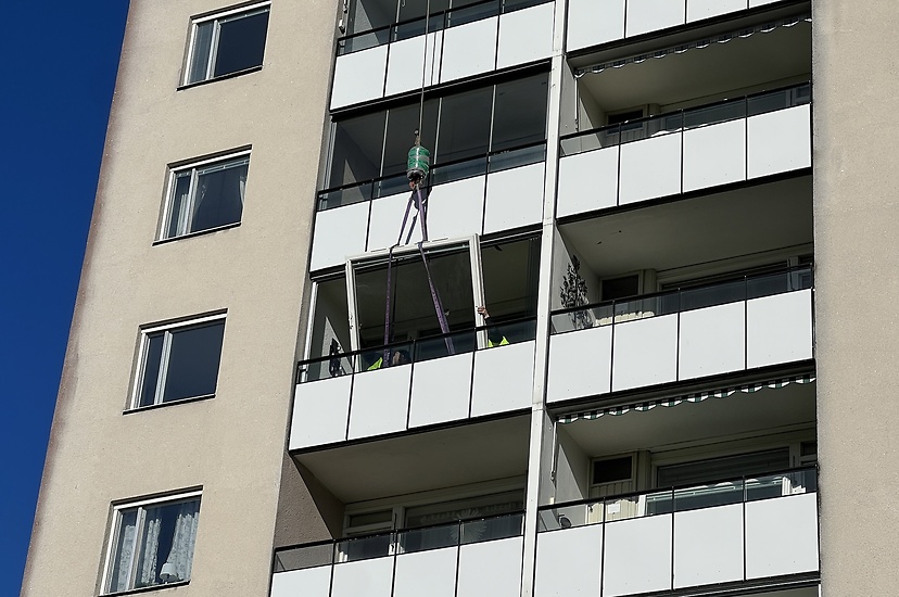 På flertalet balkongpartier installerar vi ett fönster som är 2 x 2 meter och väger ca. 150kg. Detta kräver noggrann planering, arbetsberedning och riskanalys.