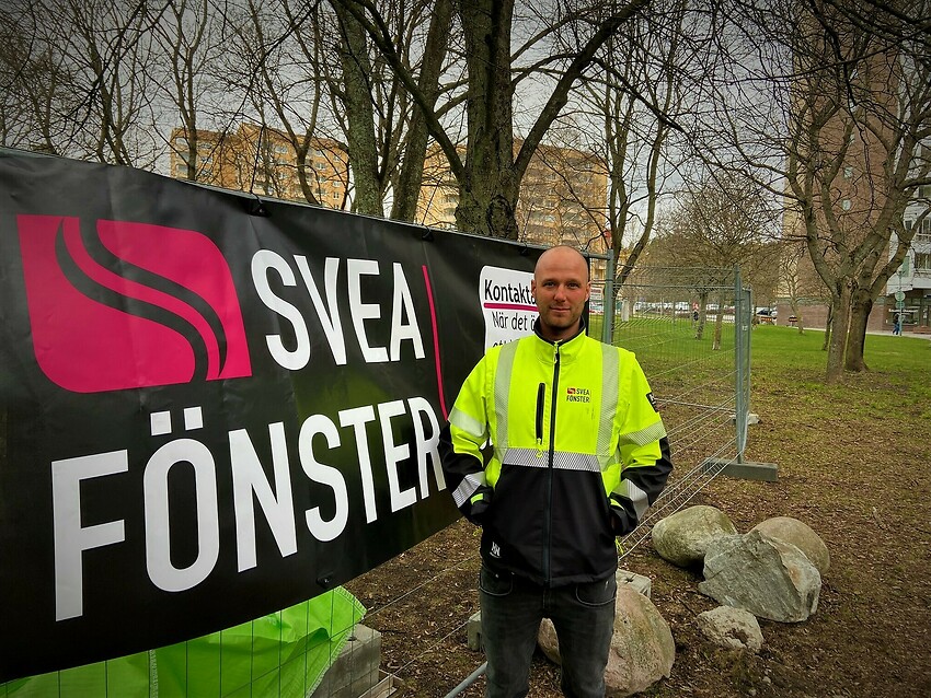 På bilden ser vi Tobias ute på Brf Annexet i Täby där vi just nu ombesörjer fönsterbyte.
